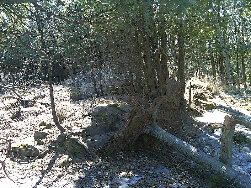 Spring is definitely making an effort but the heavy winter snows are not giving up easily. I went specifically to look for antler sheds as I found a number of good ones on this trail last year. I think the rodents have beat me to them though. Lots of rubs from the area and tons of deer.